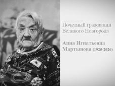 Администрация Великого Новгорода, Дума Великого Новгорода, Совет Мэров Великого Новгорода, Совет Почетных граждан Великого Новгорода, городской Совет ветеранов выражают глубокие и искренние соболезнования родным и близким Почётного гражданина Великого Новгорода, участника Великой Отечественной войны 1941-1945 гг. Анны Игнатьевны Мартыновой, которая ушла из жизни 8 февраля 2026 года, на 101-м году жизни.