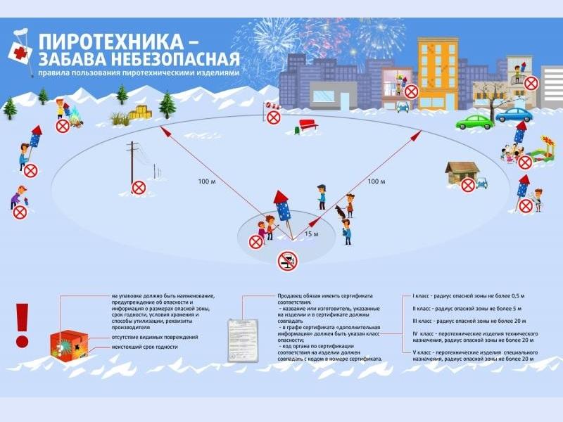 Запуск фейерверков, салютов и прочей пиротехнической продукции следует проводить только в местах, соответствующих требованиям пожарной безопасности.